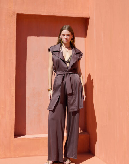 Chic and versatile, this sleeveless wrap vest features a relaxed drape and tie-waist detail for a flattering silhouette. Crafted from a smooth satin-finish fabric, it pairs effortlessly with tailored trousers or denim for a polished, modern look.