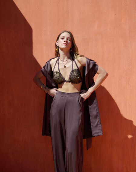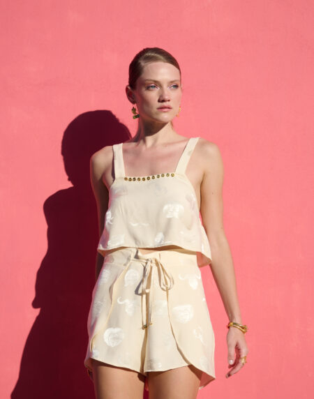 Elegant and playful, this satin crop top features a square neckline adorned with metallic embellishments and a soft, fluid drape. Lightweight and refined, it pairs perfectly with the matching shorts for a polished yet relaxed summer look.