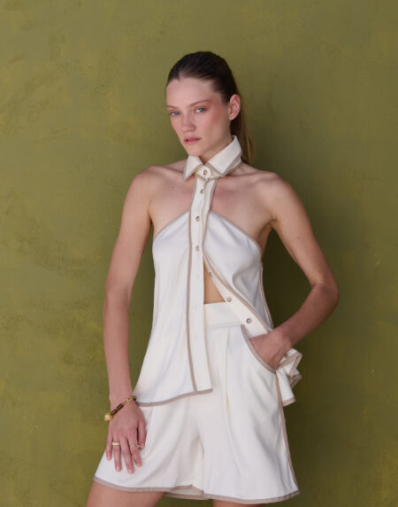 A modern reimagining of the classic button-down, this halter-style shirt features a structured collar, front button closure, and open-back silhouette. Crafted from soft satin-finish fabric, it offers a sleek, sculptural look that’s both bold and refined.