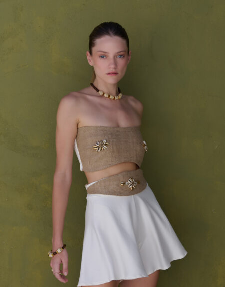 A bold and elegant statement piece, this structured bustier features natural jute-textured fabric embellished with gold floral accents. Designed with a sculpted fit and open-back silhouette, it perfectly balances artisanal charm with modern sophistication.